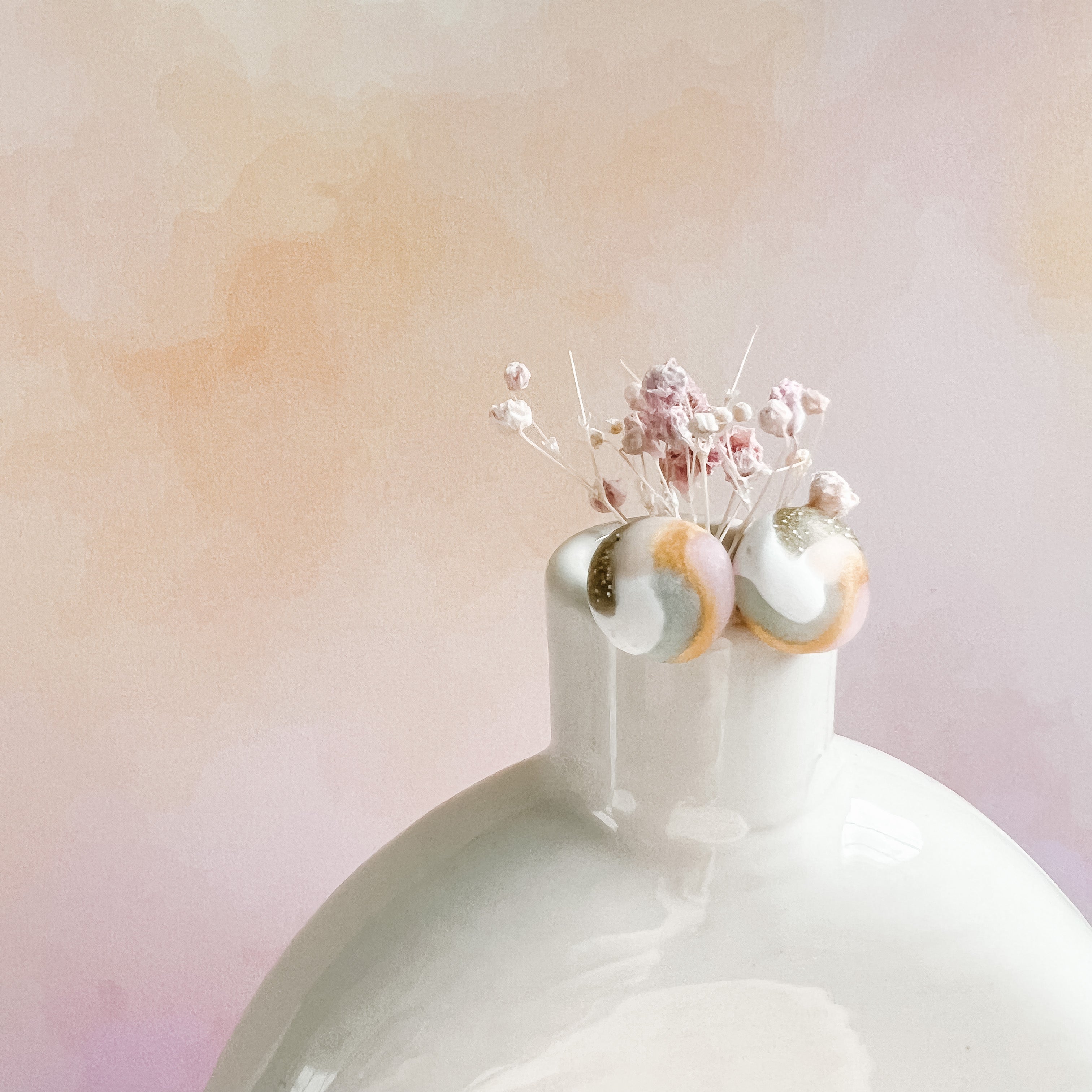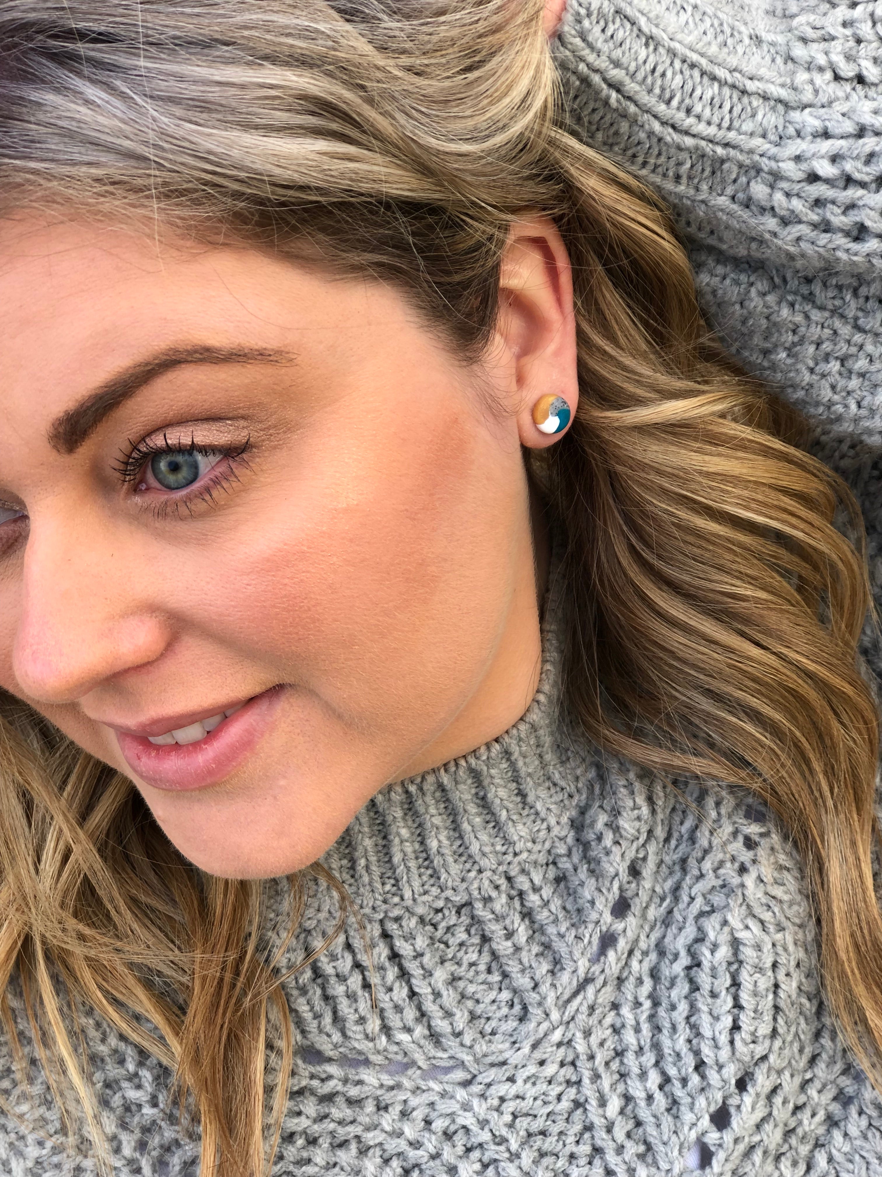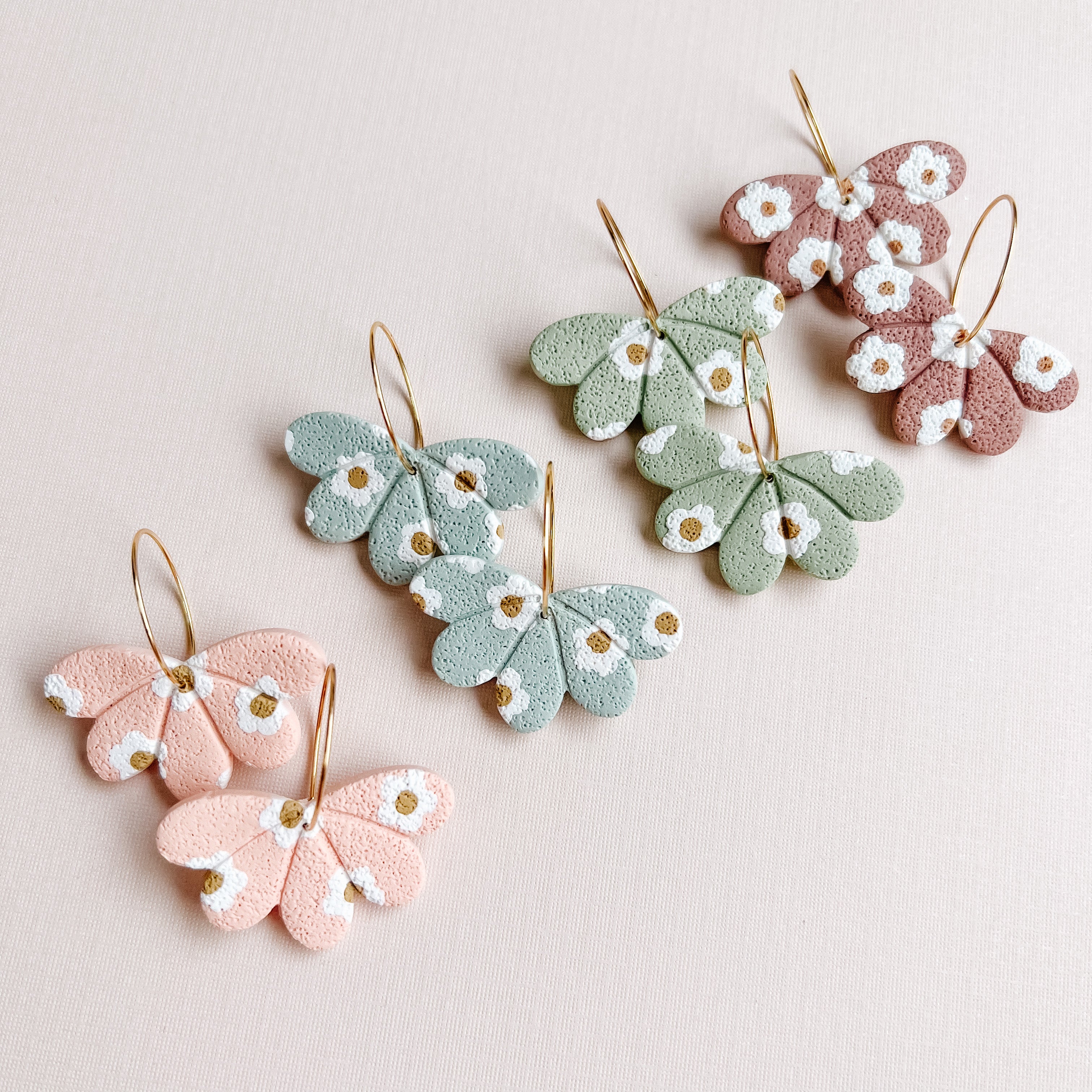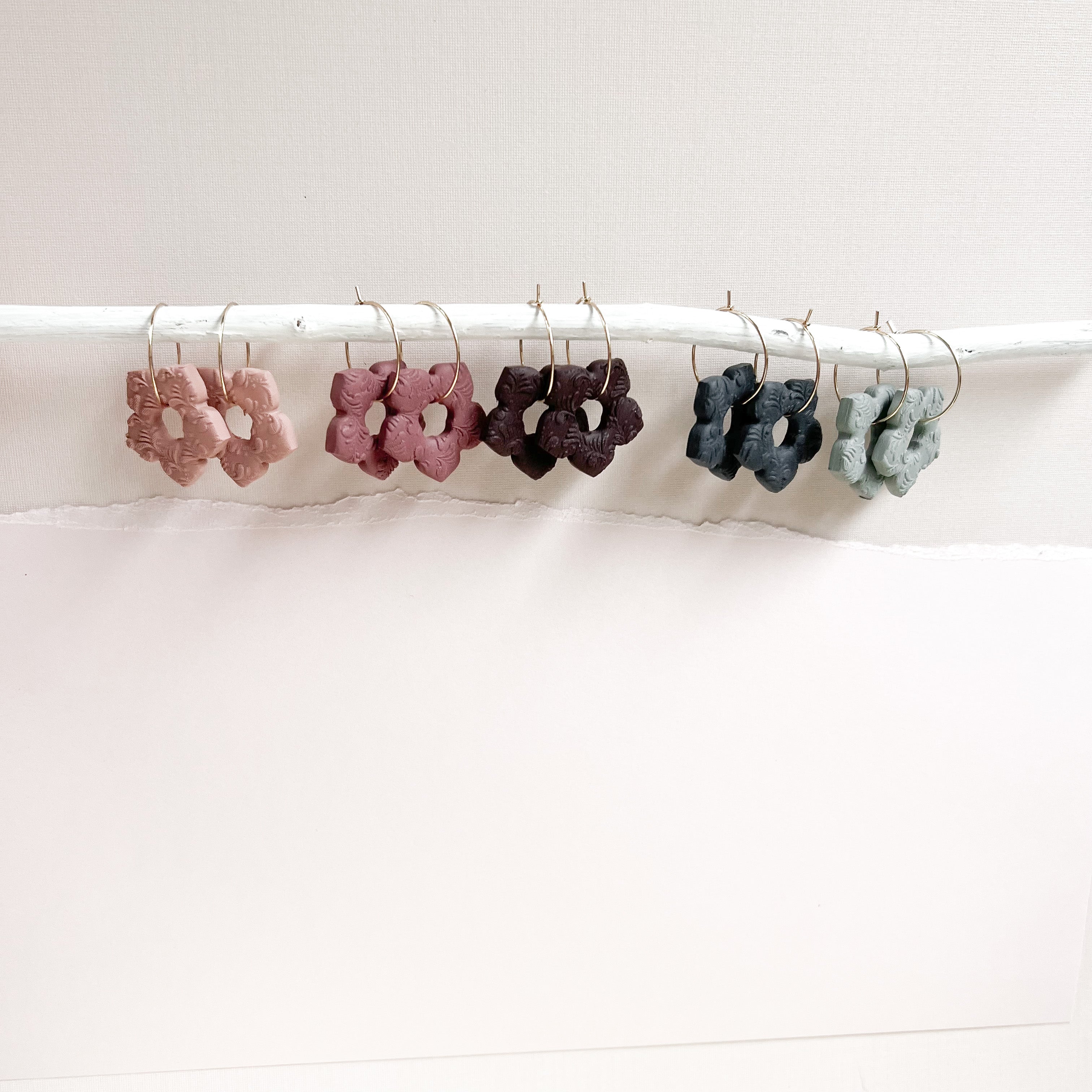 Hand-shaping, conditioning, colour-mixing, cutters, molds and detailing tools are some of the methods utilized to craft earrings. Baking, sanding, curing, drilling, buffing, painting and sealing are commonly used finishing techniques in our process of creating beautiful designs.